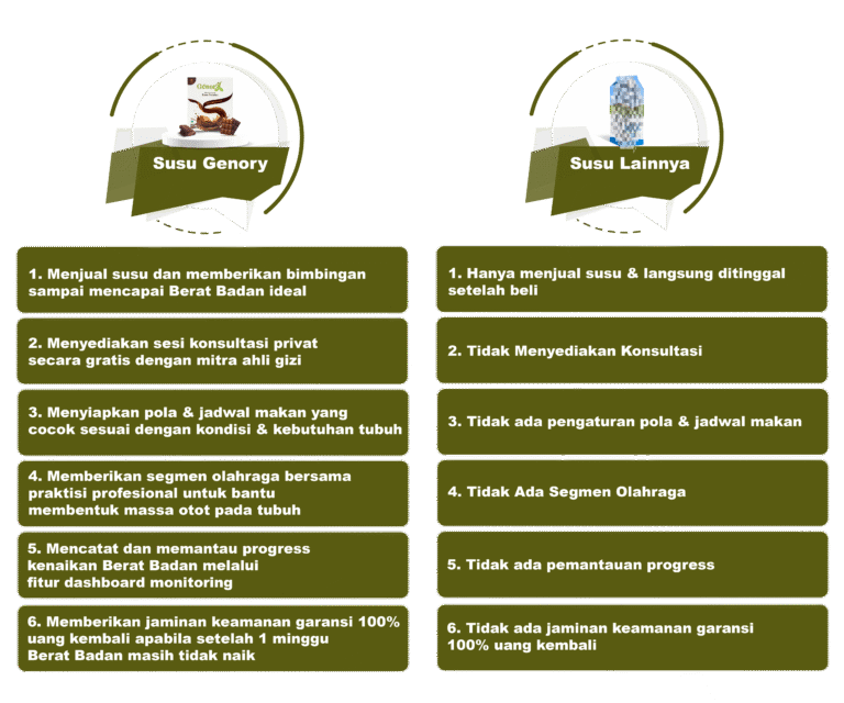 Karena kami perusahaan Genory berprinsip kepada pentingnya kualitas dan kepuasan customer sehingga kami bukan hanya menjual harapan palsu/overclaim, namun juga kualitas yang sudah dibuktikan sendiri oleh kami. Selain itu juga, kami memberikan benefit berupa konsultasi gratis 1×24 jam dengan customer service kami hingga kamu mendapatkan tubuh ideal yang kamu inginkan, lalu juga garansi uang kembali 100% apabila ternyata produk kami tidak berhasil menaikkan berat badanmu. Proses garansi bisa diklaim melalui customer service kami atau datang langsung ke kantor kami.